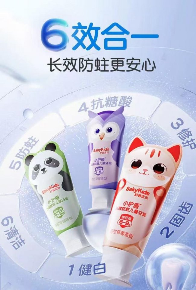 “不同时期的牙齿护理关键大不同,精准分龄才能实现更科学防蛀。”四川大学医学博士李刚教授指出,儿童口腔从乳牙萌出到恒牙长成,牙釉质硬度、矿化程度、耐磨损力等生理指标差异显著,单一配方的牙膏无法兼顾各阶段的防护需求。传统儿童牙膏往往采用统一含氟量与清洁力设计,要么因清洁力不足无法应对换牙期、恒牙期的复杂口腔环境,要么因磨料过硬损伤乳牙期娇嫩牙釉质,甚至存在含氟量不适配导致的安全隐患。舒客宝贝精准洞察这一行业短板,率先构建分龄防蛀体系,将儿童口腔护理细分为2-5岁乳牙期、6-9岁换牙期、10-12岁恒牙长成期三个阶段,实现“按需防护、精准防蛀”。